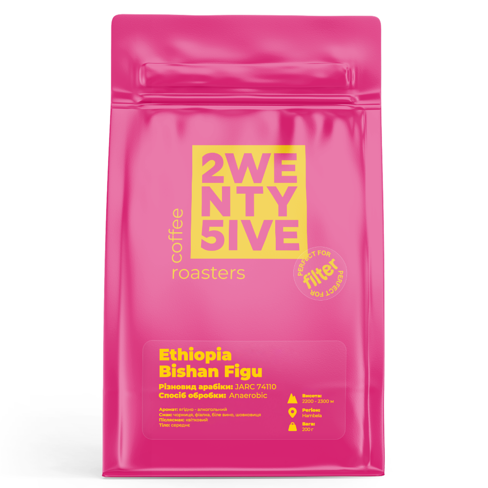 Ethiopia Bishan Figu — це кава, що пахне дикими ягодами, фіалками й легким винним настроєм. Її аромат — ніби прогулянка на світанку серед лісових ягід і квітів, коли повітря свіже, а сонце тільки торкається землі. Смак — чорниця, шовковиця, біле вино й нотки фіалки, які залишають по собі тривалий квітковий післясмак. Тіло напою середнє — кожен ковток гладко розтікається, залишаючи солодке ехо.