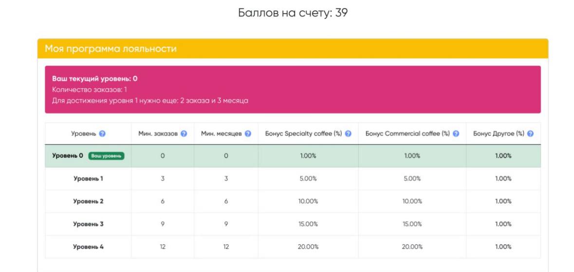 Если регулярно заказывать в течение года, то к декабрю реально достичь 20% бонусов на каждый заказ кофе и продолжать накапливать их дальше.