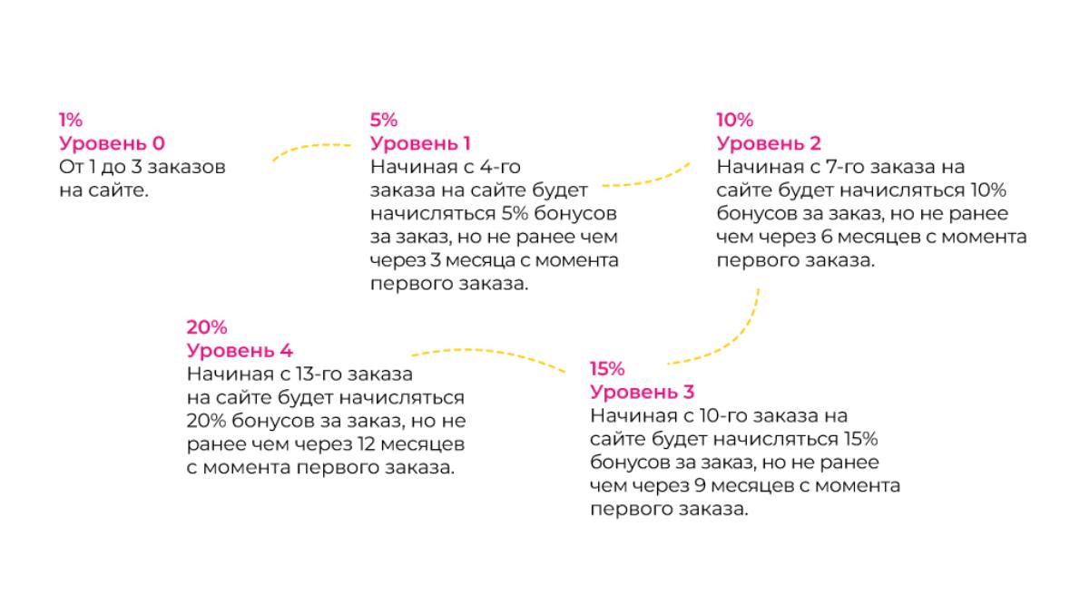 Уровень зависит от количества заказов за определенный период времени — чем чаще делаешь заказы на сайте и чем дольше ты с нами, тем выше уровень и больший процент бонусов.